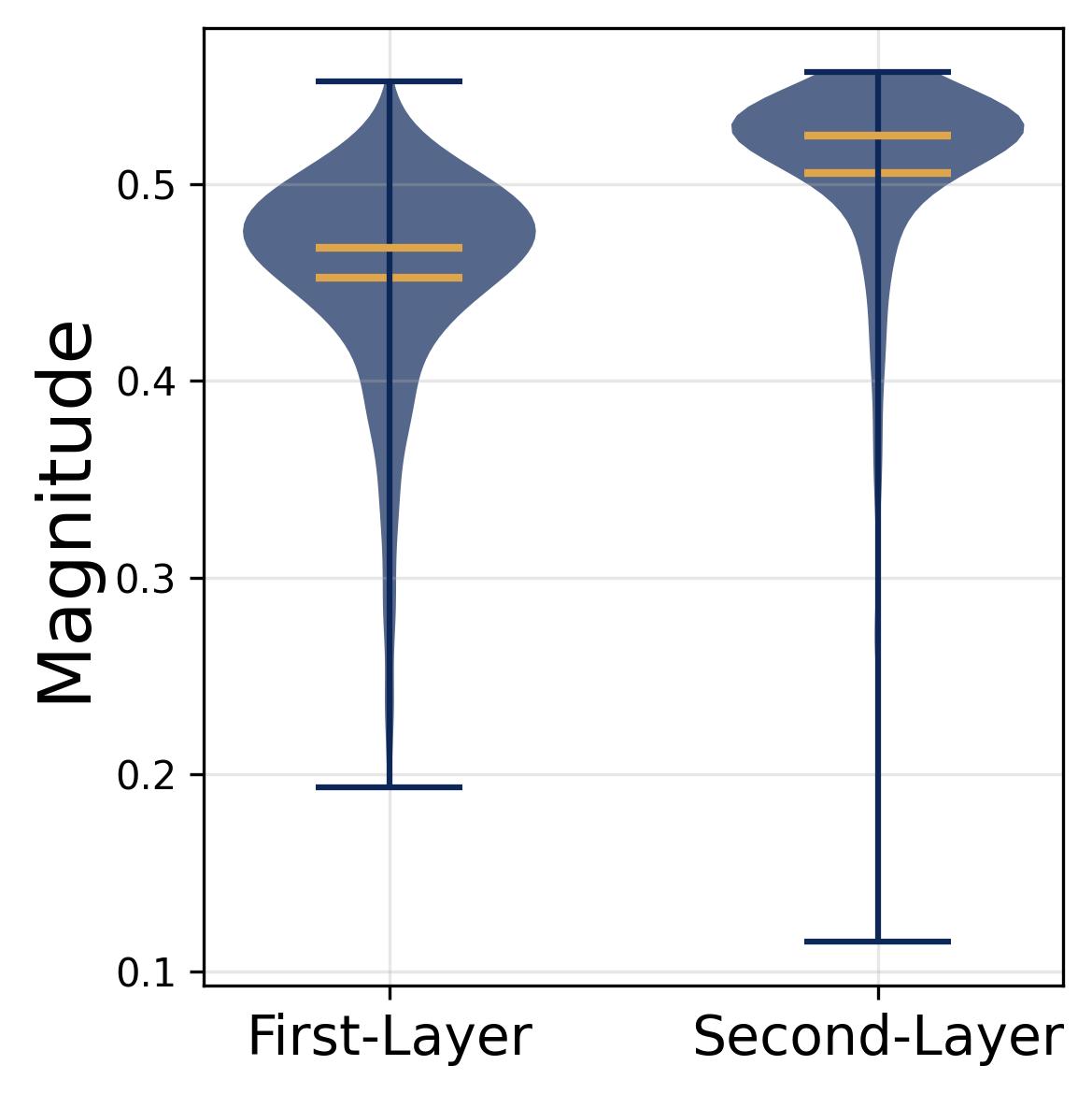 Figure 7. Magnitude homogeneity across neurons. Violin plots of the learned input magnitudes $\alpha_m$ and output magnitudes $\beta_m$ across all 512 neurons. Both distributions are tightly concentrated around their respective means, with very little spread. This confirms Observation 3(c): no single neuron dominates the network’s output. Magnitude homogeneity ensures that each neuron’s “vote” in the majority-voting mechanism carries roughly equal weight, preventing any one neuron from biasing the result. Combined with frequency balance and phase uniformity, this completes the full diversification condition required for exact noise cancellation.