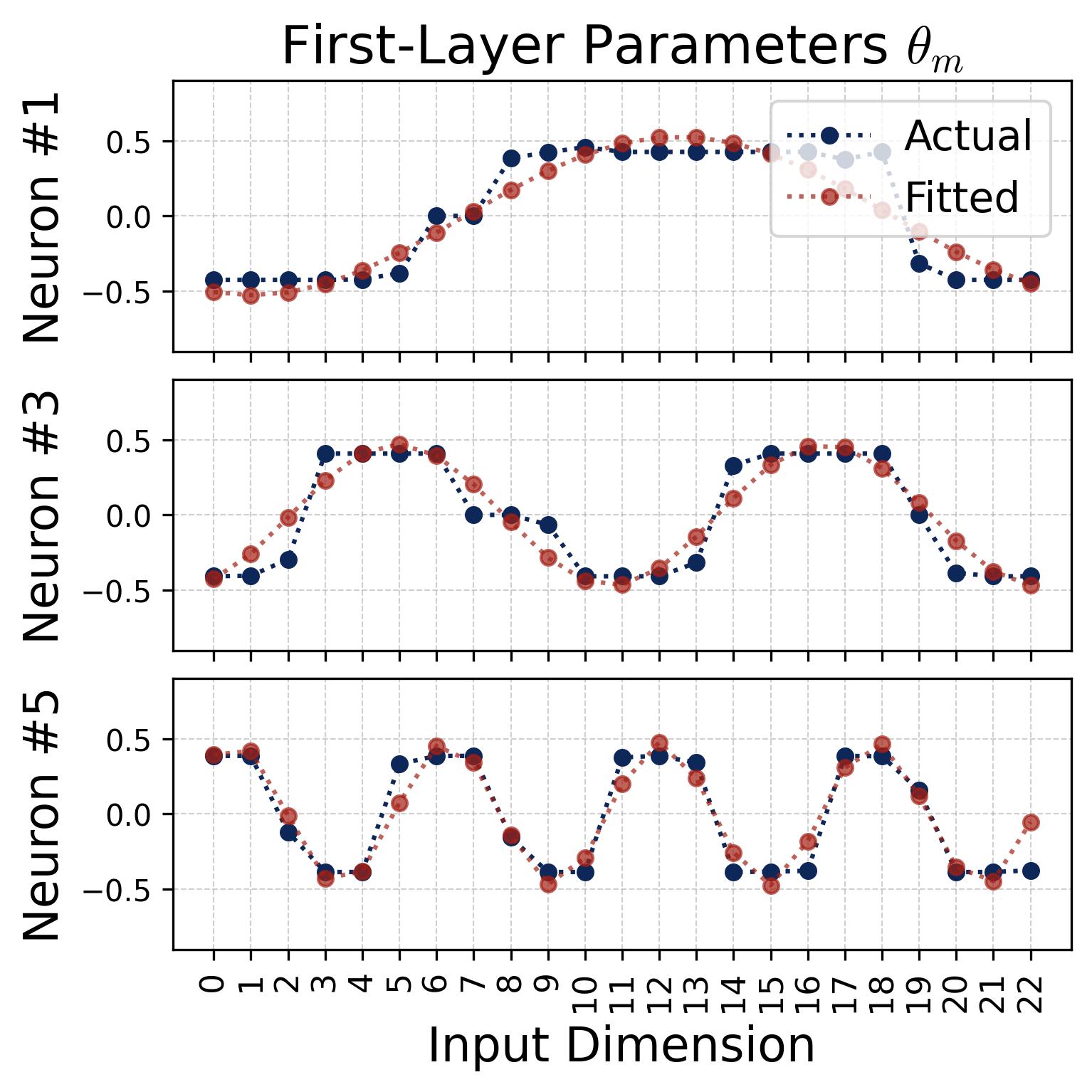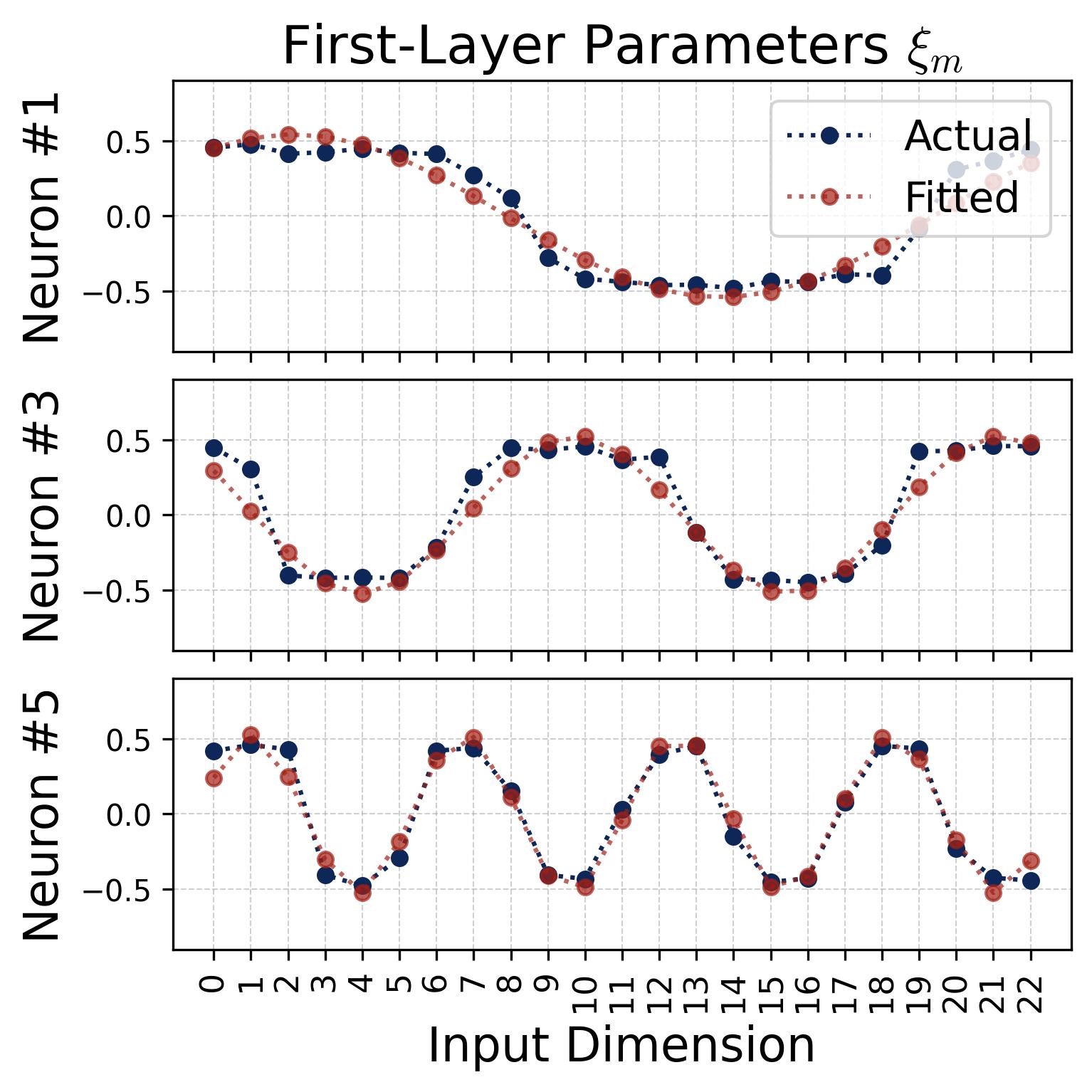 Figure 4. Cosine fits to individual neurons. For several representative neurons, we plot the raw learned weight values (blue dots/curves) against the index $j = 0, 1, \ldots, p-1$ and overlay a best-fit cosine of the form $a \cdot \cos(\omega_k j + \phi)$ (red dashed curves), where $a$ and $\phi$ are the fitted magnitude and phase. Left: input weights $\theta_m[j]$. Right: output weights $\xi_m[j]$. The fits are nearly perfect (residuals are negligible), confirming that each neuron’s weight vector is well-described by a single cosine at one Fourier frequency. Different neurons fit to different frequencies $k$ and different phases $\phi_m$, $\psi_m$, consistent with the diversification described in Observation 3.