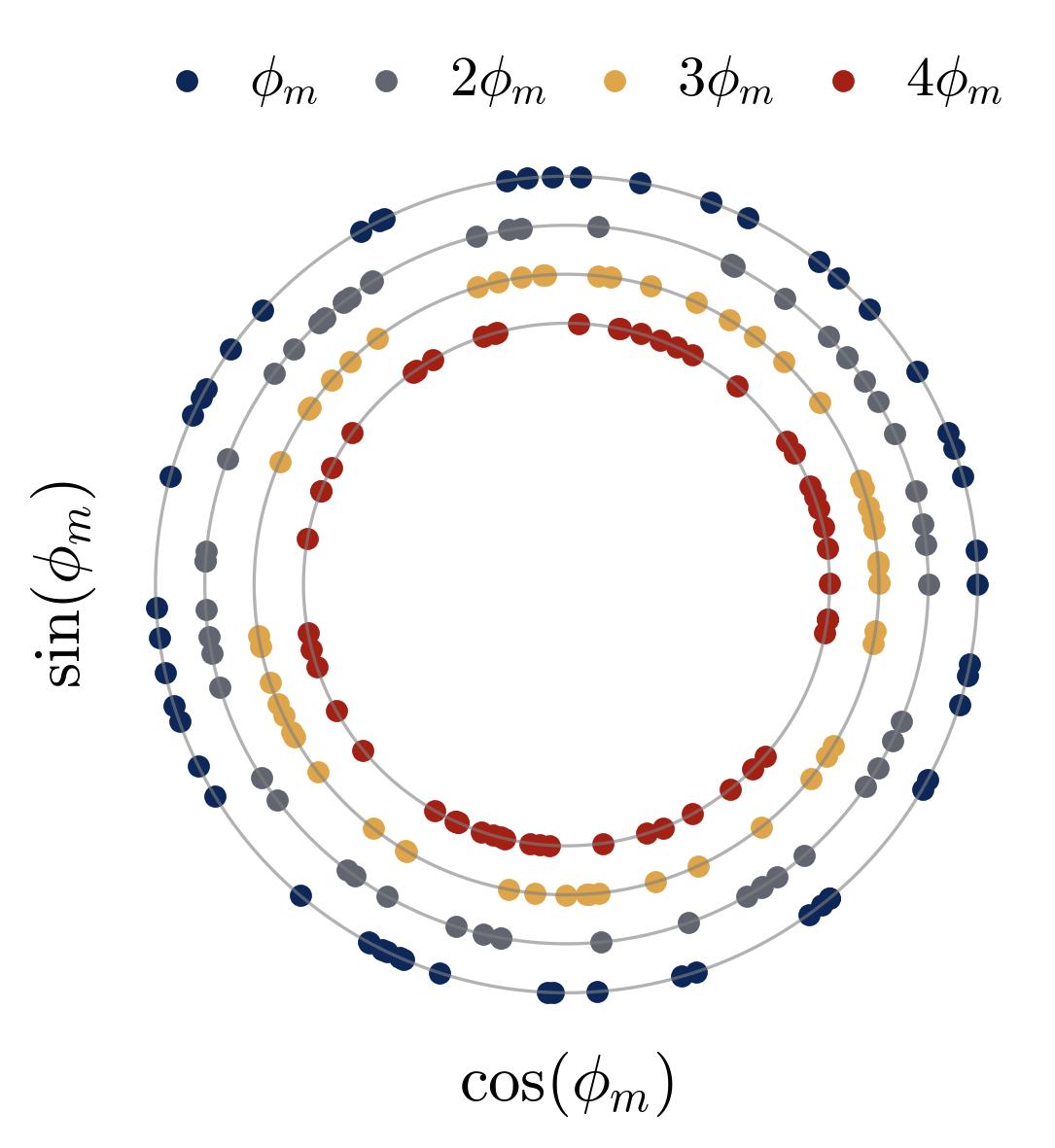 Figure 6. Higher-order phase symmetry within a frequency group. For a single frequency group $\mathcal{N}_k$ (all neurons sharing the same dominant frequency $k$), we plot the phase angles $\iota \cdot \phi_m \bmod 2\pi$ on concentric polar rings for $\iota = 1, 2, 3, 4$. Each dot is one neuron. The near-uniform spacing around every ring confirms that the phases satisfy the symmetry conditions $\sum_m e^{i \cdot \iota \cdot \phi_m} \approx 0$ for $\iota = 2, 4$ — the exact conditions required for noise cancellation in the majority-voting mechanism. Without this symmetry, the phase-dependent noise terms would persist and the network could not achieve perfect accuracy. The network learns this symmetric configuration spontaneously.