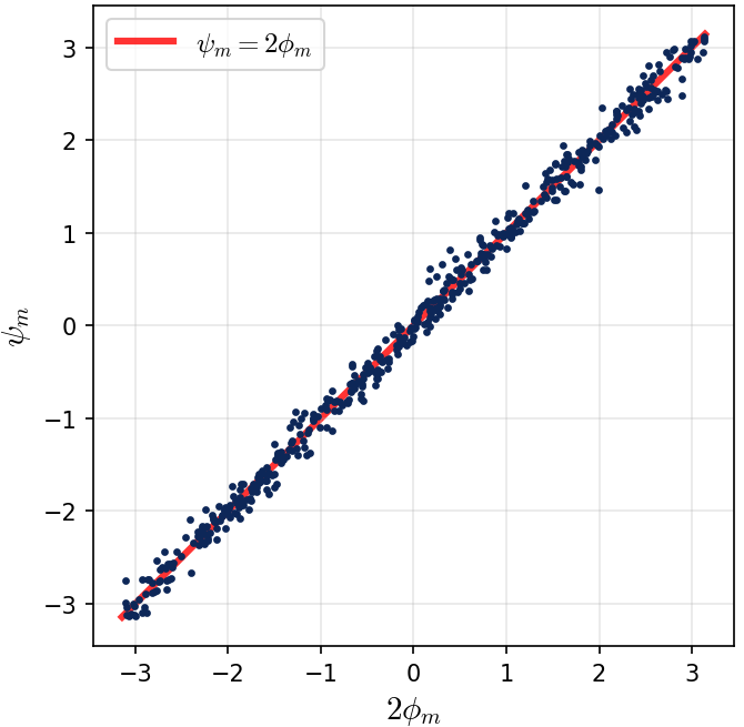 $$\psi_m = 2\phi_m \pmod{2\pi}.$$If we scatter-plot $(2\phi_m \bmod 2\pi,\; \psi_m \bmod 2\pi)$ across all 512 neurons, every point falls on the diagonal line $y = x$.