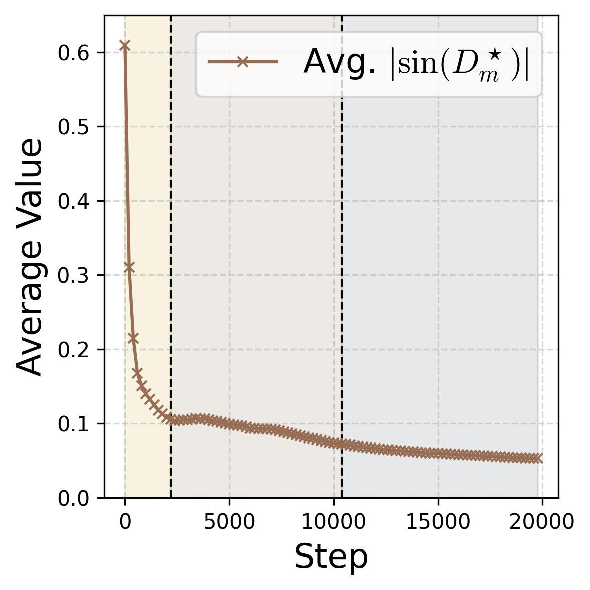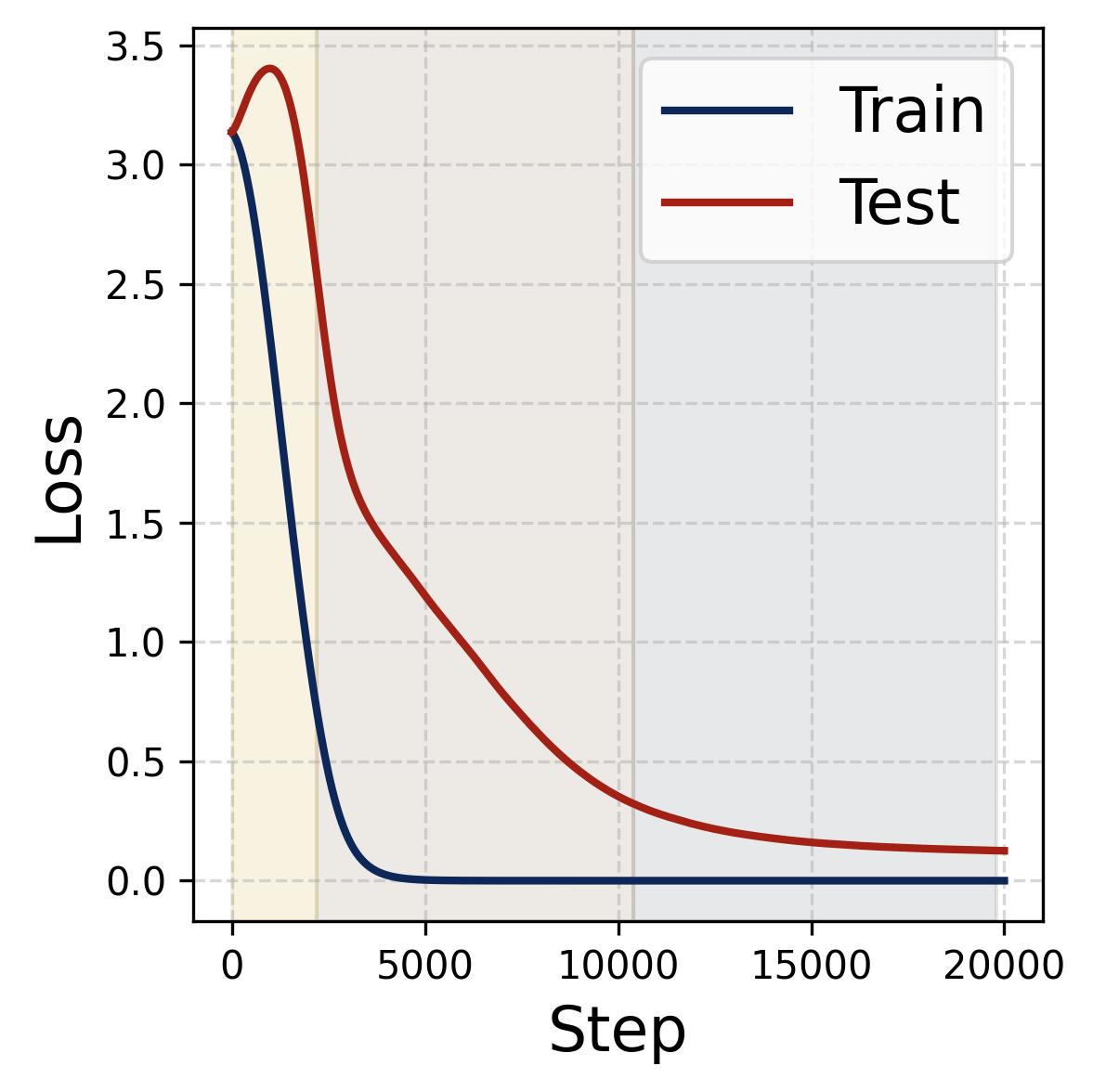 Figure 14. Four progress measures reveal the three stages of grokking. The network is trained on 75% of all $(x,y)$ pairs with weight decay $\lambda = 2.0$. The three colored background regions (yellow, tan, gray) correspond to the three stages, separated by dashed vertical lines at ~2,200 and ~10,000 steps. (a) Loss: Training loss (dark blue) drops rapidly to near zero within the first ~2,000 steps (Stage I), while test loss (dark red) remains high, then drops sharply during Stage II and slowly decays during Stage III. (b) Accuracy: Training accuracy (dark blue) reaches 100% early; test accuracy (dark red) plateaus at ~70% during memorization (because the symmetric architecture gives “free” accuracy on $(y,x)$ pairs), then climbs to ~95% during Stage II, and converges toward 100% during Stage III. (c) Phase alignment: The average $|\sin(\mathcal{D}_m^\star)|$ (measuring misalignment of the dominant frequency’s phases) decreases throughout, confirming that phase alignment continues to improve even after memorization. (d) Frequency sparsity (IPR) and parameter norm: The average IPR (brown, left axis; higher = sparser) increases throughout training as neurons concentrate energy at fewer frequencies. The parameter norm (dark blue, right axis) grows rapidly during Stages I-II when the loss gradient dominates, then plateaus and slightly decreases once weight decay takes over in Stage III.