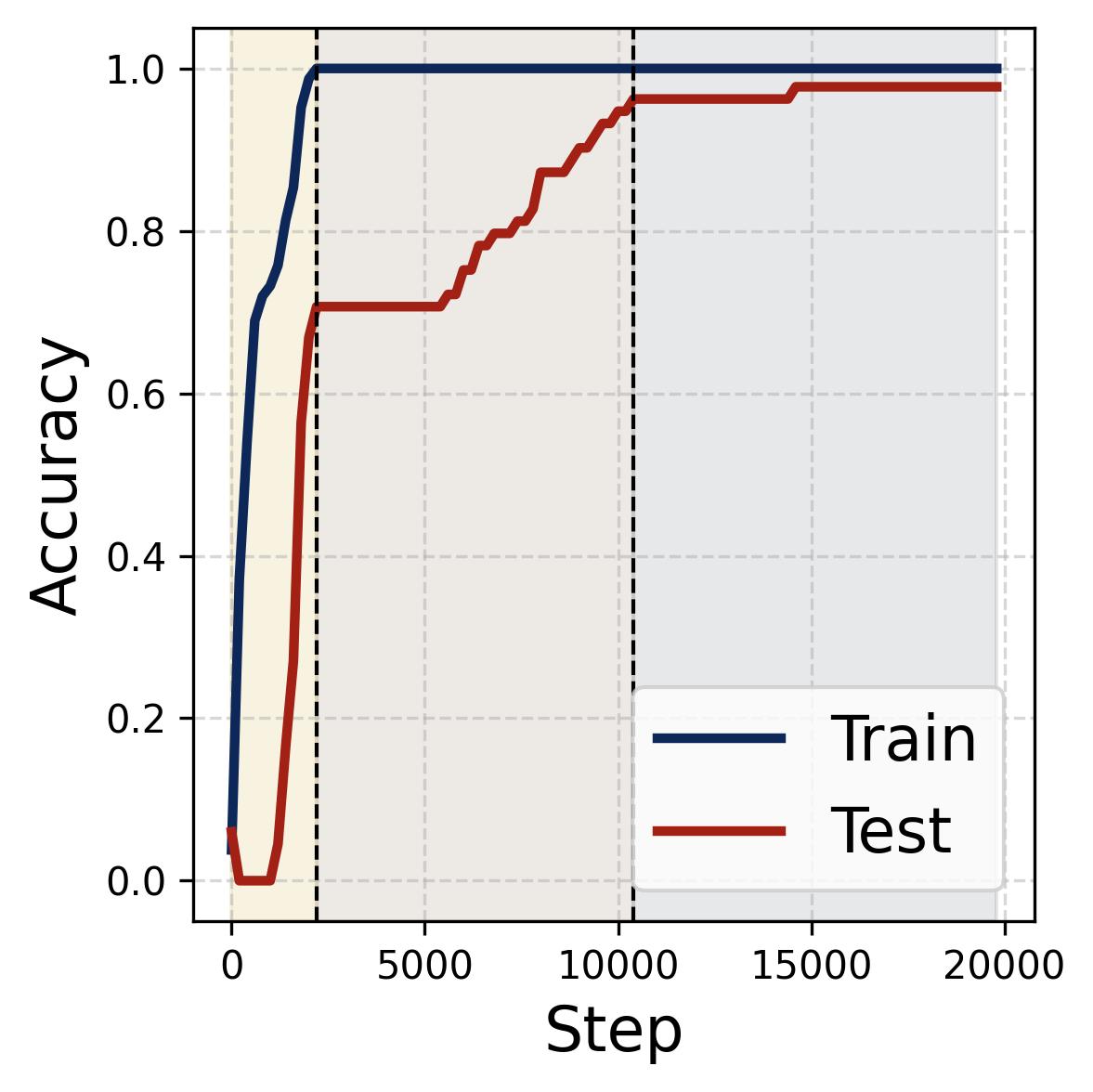 We now turn to the most dramatic phenomenon: grokking. Under the train-test split setup (75% training data, weight decay of 2.0; see Section 2), a striking pattern emerges: the network quickly memorizes the training set, achieving 100% training accuracy, but then takes much longer (often orders of magnitude more training steps) to generalize to the held-out test set. This delayed generalization is grokking.
