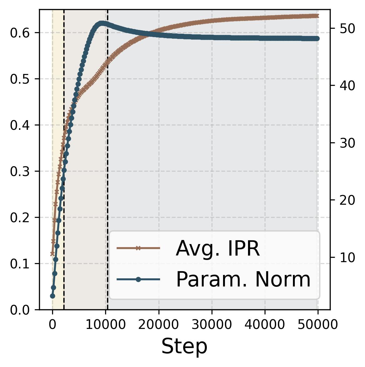 Eventually, the loss gradient becomes negligible (both training and test loss approach zero). Weight decay takes over completely, slowly shrinking all parameter norms. This is visible in Figure 14(d): the IPR (frequency sparsity) continues to increase while the parameter norm decreases, confirming that weight decay is the sole active force, steadily refining the representation.