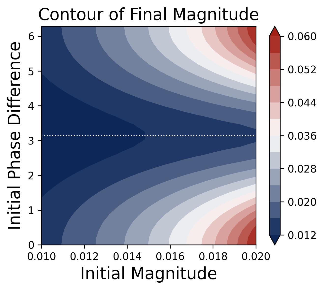 Figure 11. Outcome of the lottery as a function of initial conditions. Contour plot showing the final learned magnitude $\beta_m^k$ (color) as a function of two initial-condition variables: the initial magnitude $\beta_m^k(0)$ (horizontal axis) and the initial phase misalignment $\mathcal{D}_m^k(0)$ (vertical axis). The largest final magnitudes (brightest region, bottom-right) correspond to frequencies that start with large initial magnitude and small phase misalignment — the “winning lottery tickets." The contours are symmetric about $\mathcal{D} = \pi$, confirming that only the distance $|\mathcal{D} - 0|$ (not its sign) determines the outcome. Frequencies starting near $\mathcal{D} = \pi$ (the dotted horizontal line at the center of the y-axis) achieve negligible final magnitude regardless of their initial size, because they are trapped near the unstable fixed point before escaping and aligning.