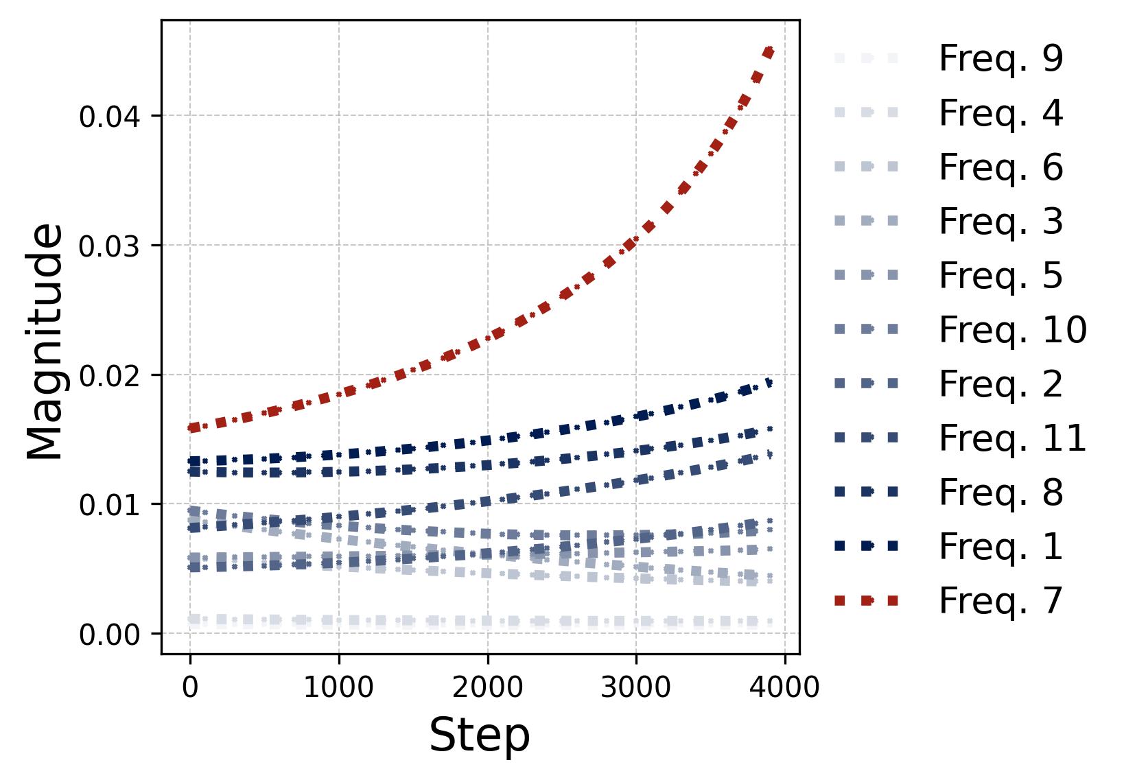Figure 10. The lottery ticket race within a single neuron. We track all $(p-1)/2 = 11$ frequency components within one neuron during training under random initialization. Left (phase misalignment): Each curve shows $\mathcal{D}_m^k(t) = (2\phi_m^k - \psi_m^k) \bmod 2\pi$ (rescaled to $[-\pi, \pi)$) for a different frequency $k$. The winning frequency (Freq. 7, highlighted in red) starts with the smallest initial misalignment and converges to $\mathcal{D} = 0$ fastest. The losing frequencies drift slowly but their alignment does not matter because their magnitudes never grow large enough to compete. Right (magnitudes): The corresponding output magnitude $\beta_m^k(t)$ for each frequency. The legend is sorted by initial magnitude. Once the winning frequency’s phase aligns ($\mathcal{D} \approx 0$), its magnitude undergoes explosive super-linear growth (visible as the red curve pulling away after step 1,000), while all other frequencies grow only slowly and remain far below the winner. This is the positive feedback loop: better alignment leads to faster growth, which in turn accelerates alignment. The winner is determined at initialization by the combination of initial magnitude and initial phase misalignment.