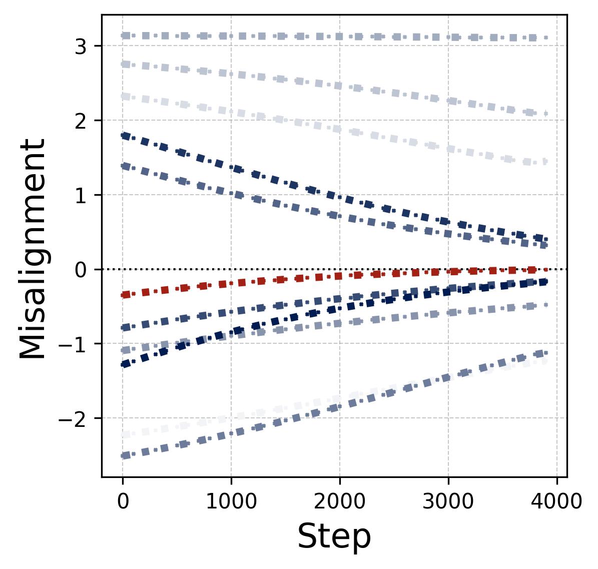 Since the initial misalignments are independent and uniformly distributed, different neurons generically select different winning frequencies. With enough neurons ($M \gg (p-1)/2$), all frequencies are covered, explaining Observation 1 (single-frequency structure) and contributing to Observation 3 (frequency balance).
