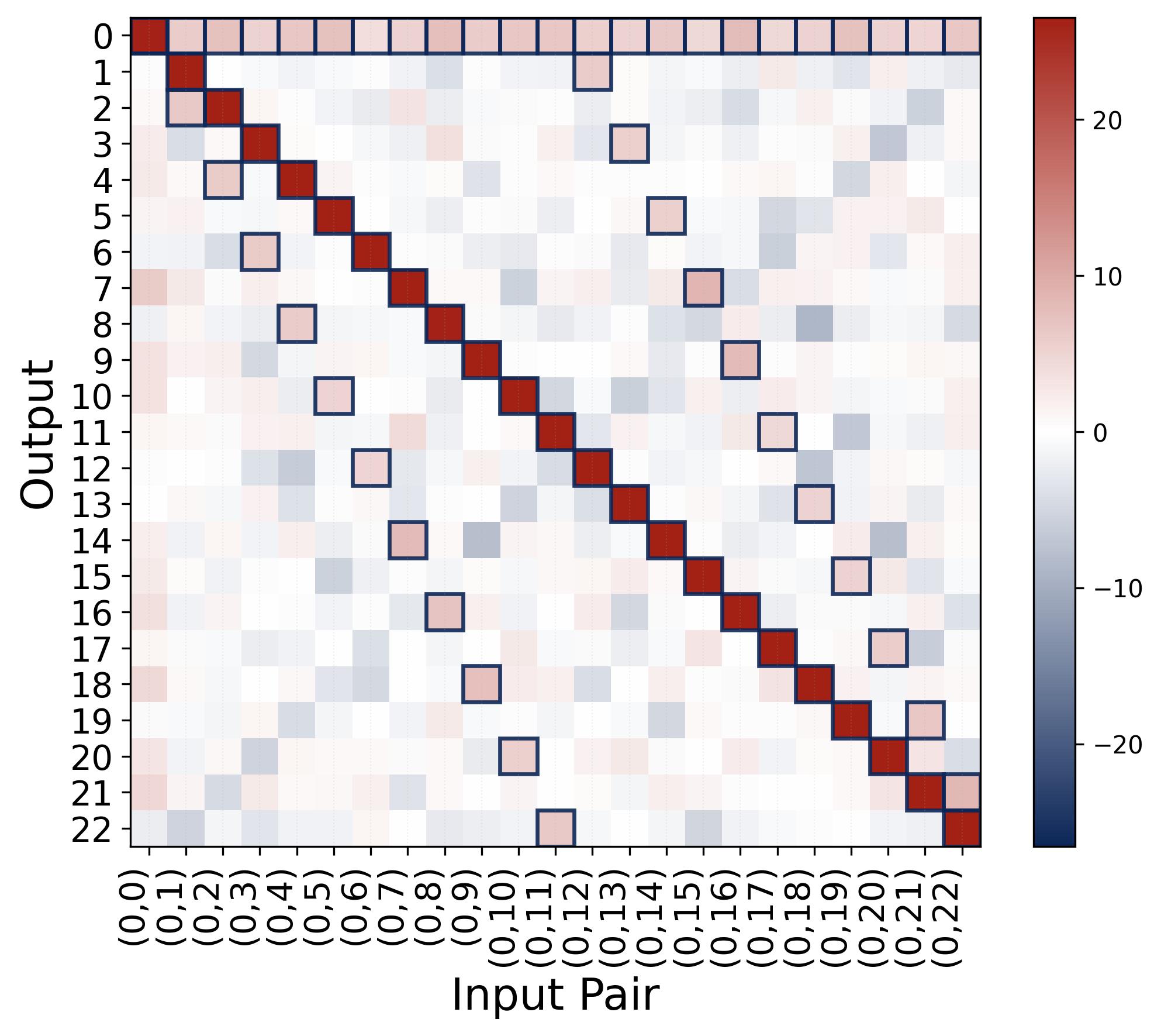 Figure 8. Output logits confirm the indicator-function structure. The heatmap shows the output logit $f(x, y)[j]$ for fixed $x = 0$ and all $y \in \{0, \ldots, 22\}$ (columns) versus output index $j$ (rows), with $p = 23$ and quadratic activation. The bright red diagonal marks the correct answer $j = (0 + y) \bmod 23 = y$, which receives the highest logit (around $+25$). For example, at input $(0, 5)$, the brightest cell is at output $j = 5$. The faint pink cells (marked by small boxes) are the spurious peaks predicted by Proposition 1, located at $j = 2x \bmod 23 = 0$ (a persistent faint row along output 0) and $j = 2y \bmod 23$ (a secondary diagonal; for input $(0, 5)$, this appears at output $j = 10$). These spurious peaks have logits roughly half as large as the correct answer (approximately $aNp/8$ vs. $aNp/4$). The visible color difference between the bright red correct cells and the faint pink spurious cells reflects the margin of $aNp/8$ that separates them. The softmax amplifies this gap exponentially, turning even a modest margin into near-certain predictions. All remaining cells are near the background level (blue/white, around $-aN/2$).