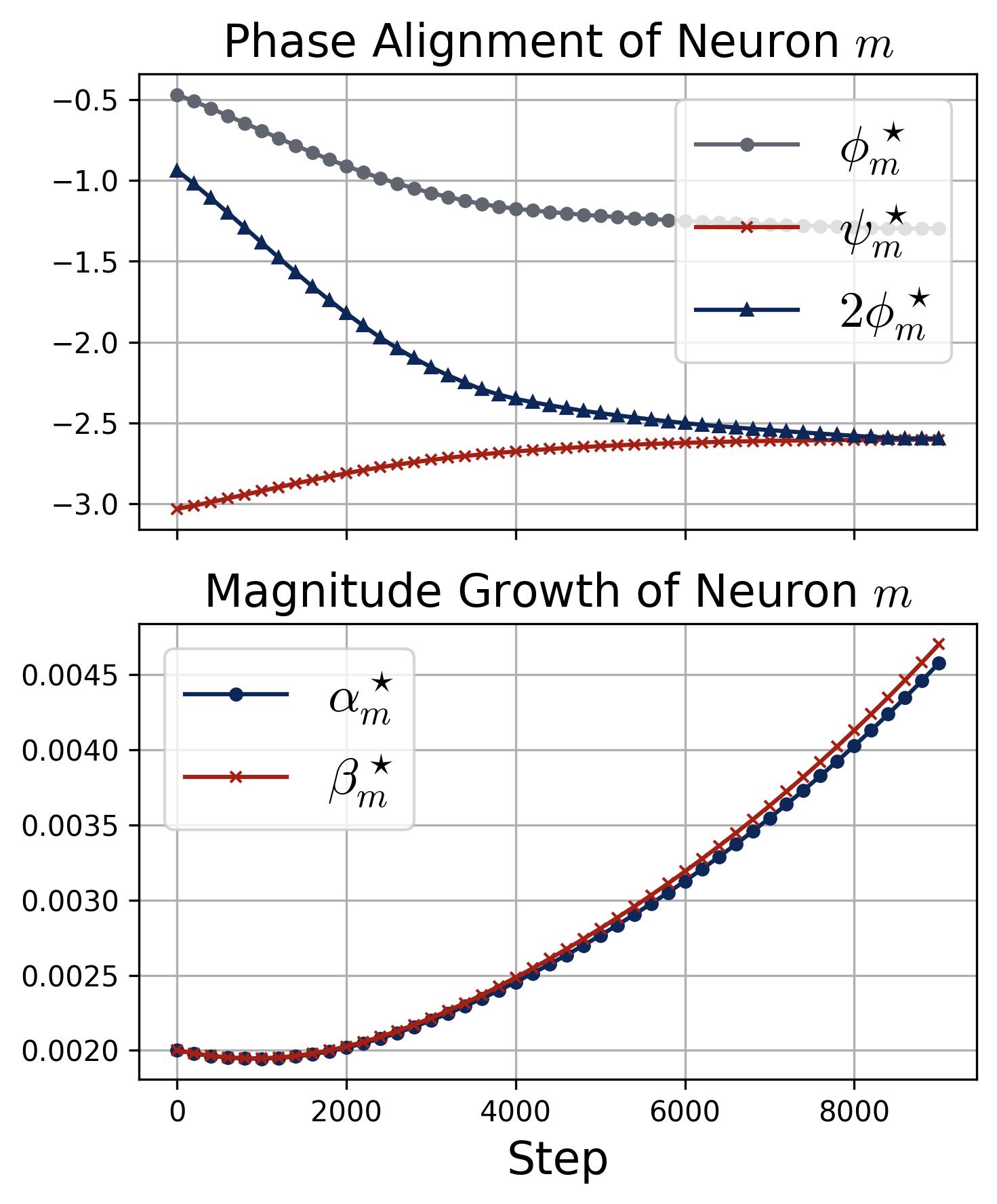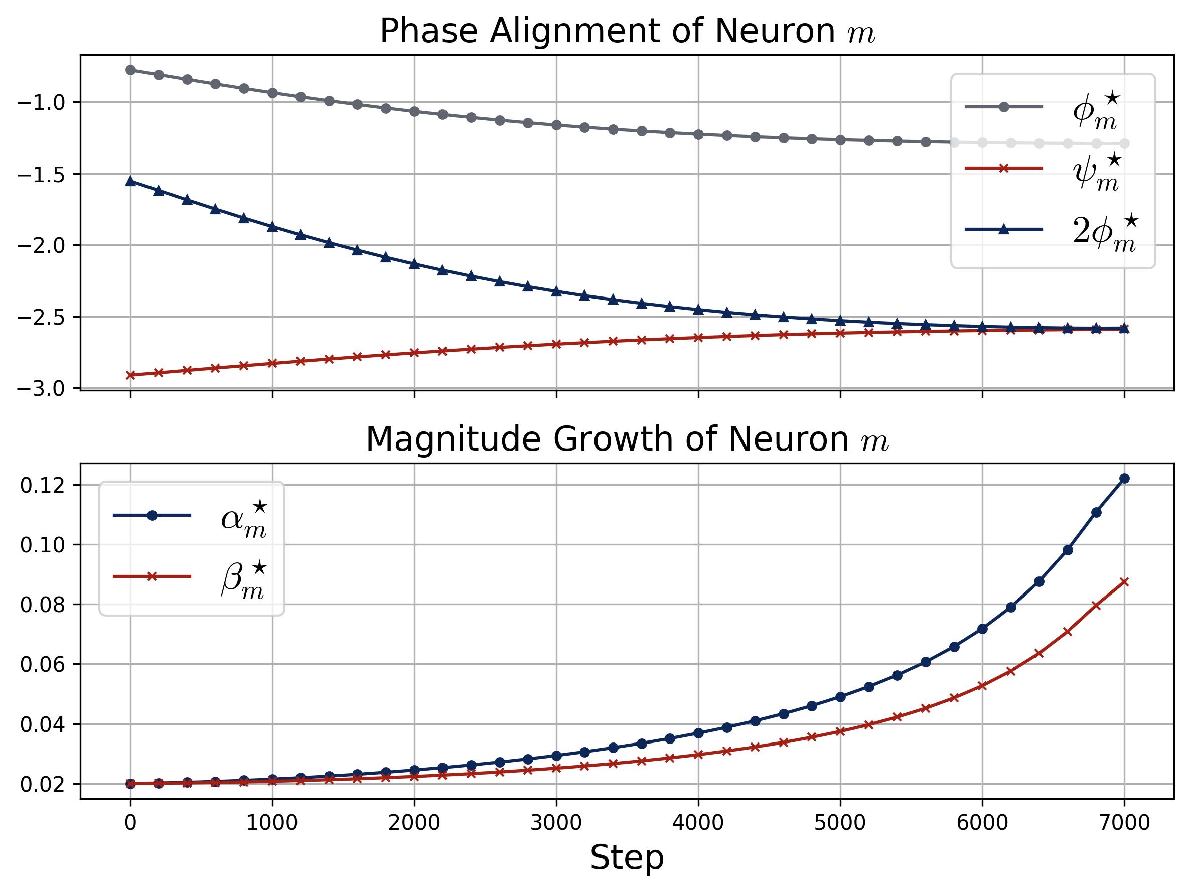 Figure 9. Phase alignment and magnitude growth for a single neuron. Two stacked panels track the dynamics of a specific neuron $m$ during training (quadratic activation, $\kappa_{\text{init}} = 0.02$). Top (Phase Alignment): Three curves show $\phi_m^\star$ (gray), $\psi_m^\star$ (red), and $2\phi_m^\star$ (dark blue with triangles) over training steps. The key observation is that $2\phi_m^\star$ and $\psi_m^\star$ converge toward each other, confirming that the phase misalignment $\mathcal{D}_m^\star = (2\phi_m^\star - \psi_m^\star) \bmod 2\pi$ is driven to zero, exactly as predicted by the zero-attractor ODE. Bottom (Magnitude Growth): The input magnitude $\alpha_m^\star$ (blue) and output magnitude $\beta_m^\star$ (red) both start at $\kappa_{\text{init}} = 0.02$ and remain nearly flat while the phases are still misaligned, then accelerate rapidly once alignment is achieved (around step 4,000). This confirms the self-reinforcing loop: alignment enables growth, and growth accelerates alignment.