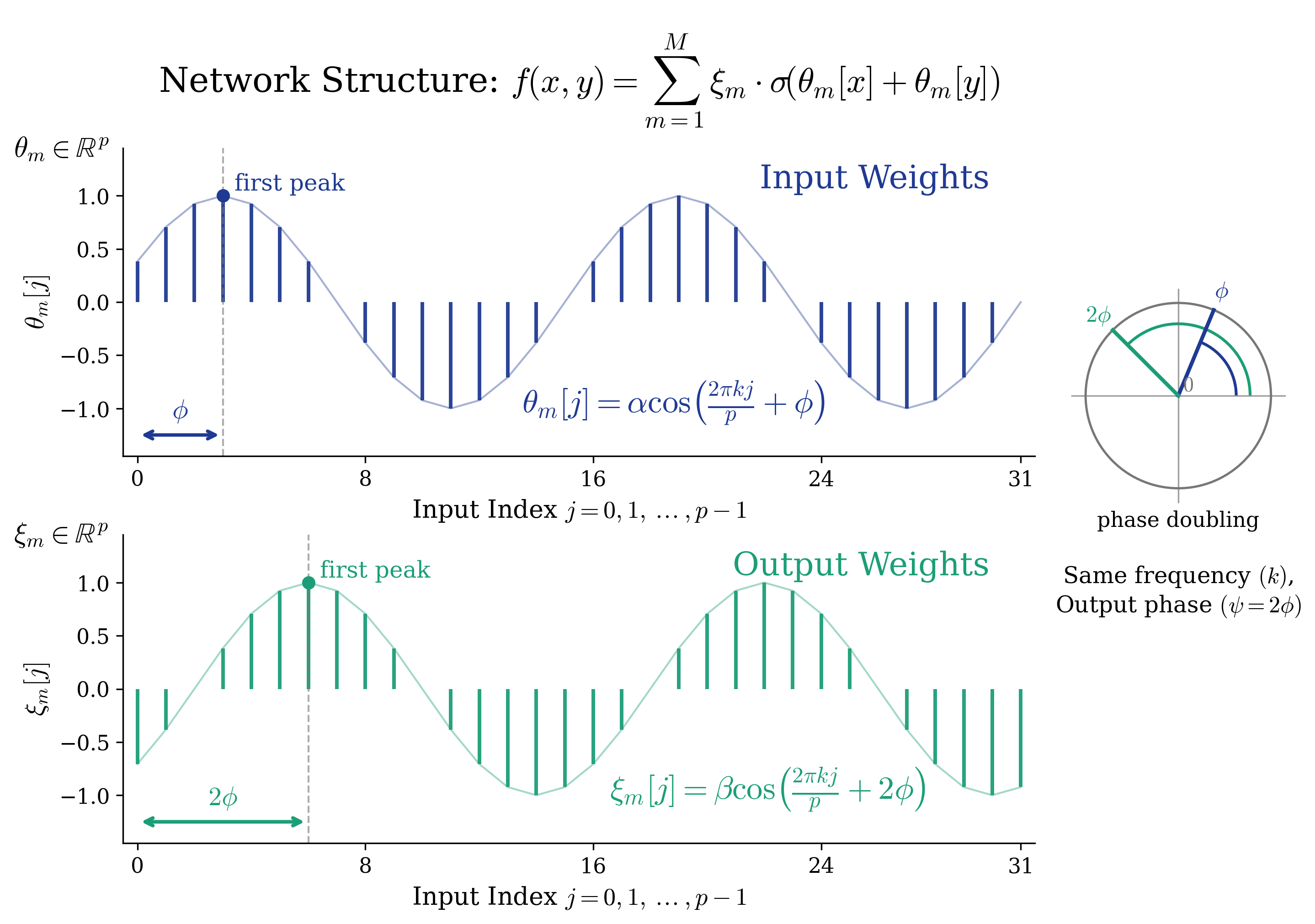 Figure 2. Anatomy of a single trained neuron: cosine weights and phase doubling. After training, each neuron $m$ in the two-layer network $f(x,y) = \sum_m \xi_m \cdot \sigma(\theta_m[x] + \theta_m[y])$ develops a striking structure. Top: the input weight vector $\theta_m \in \mathbb{R}^p$ traces a clean cosine curve $\alpha \cos(2\pi k j / p + \phi)$ at a single frequency $k$, with input phase $\phi$. Bottom: the output weight vector $\xi_m \in \mathbb{R}^p$ is also a cosine at the same frequency $k$, but its phase is exactly doubled: $\psi = 2\phi$ (green arrow), as illustrated by the polar diagram on the right. These two properties — single-frequency cosine structure (Observation 1) and the $\psi = 2\phi$ phase alignment (Observation 2) — are the building blocks of the network’s Fourier-based algorithm for modular addition.