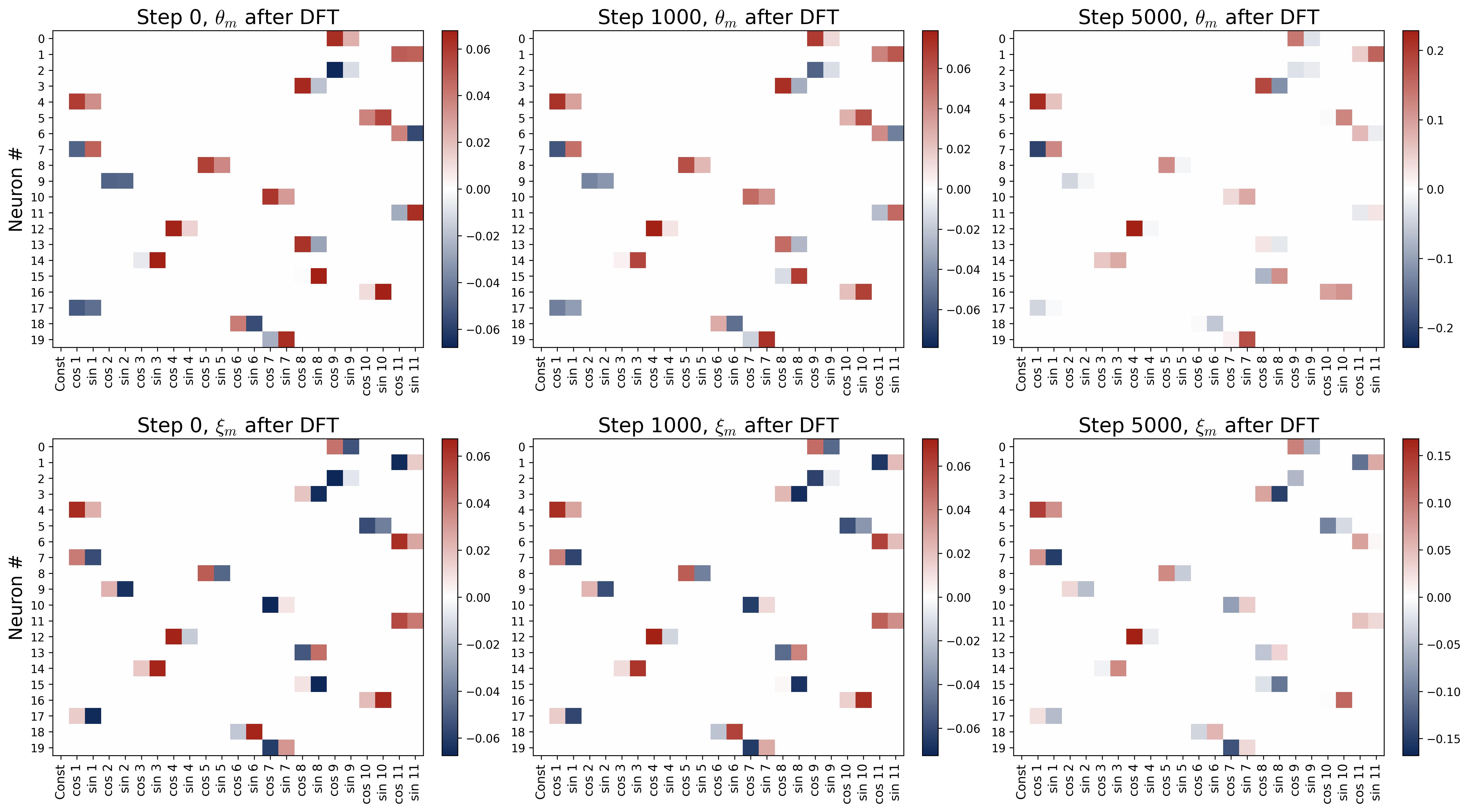Figure 17. Weight evolution in the Fourier domain during grokking. Six panels arranged in a 2×3 grid show the DFT heatmaps of the first 20 neurons’ weights at three training snapshots ($p = 23$, train-test split). Top row: input weights $\theta_m$; bottom row: output weights $\xi_m$. Rows are neurons; columns are Fourier frequencies; color indicates DFT coefficient value. Step 0 (left): weights are diffuse across all frequencies with no discernible structure, as expected from random initialization. Step 2,200 (middle, end of memorization): a rough single-frequency pattern has started to emerge (visible as one bright cell per row), but substantial energy remains at non-feature frequencies. This is the “noisy” perturbed Fourier solution that suffices for memorization but not generalization. Step 10,000 (right, after generalization): essentially all energy resides at a single frequency per neuron, matching the clean fully-trained solution from Part I. The transition from the noisy middle panels to the clean right panels is driven by weight decay, which selectively prunes the weaker non-feature frequencies during Stages II and III.